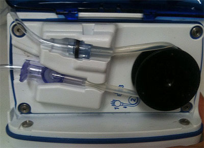 Come si vede da questa foto il tubo del set deve girare intorno al rotore della pompa (il cilindro nero). Bisogna introdurlo nella prima tacca, poi girare intorno al rotore TIRANDO e quindi inserire l'altra estremità nella seconda sacca. Guardate il disegno e fate i vari tentativi, quando siete riusciti la pompa scriverà "Set caricato".
